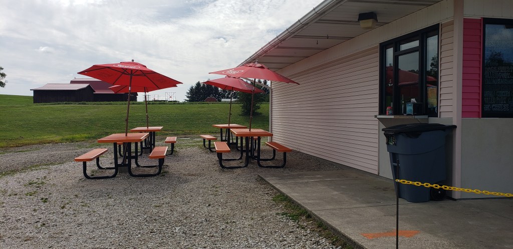 Mr. Shivers is an ice cream and food stand, with seating on both sides. To the left you’ll see tables with umbrellas, and to the right a bar like seating area. You order at a window, and will pick up your order in that same window or another, depending on how busy the stand is at the time.