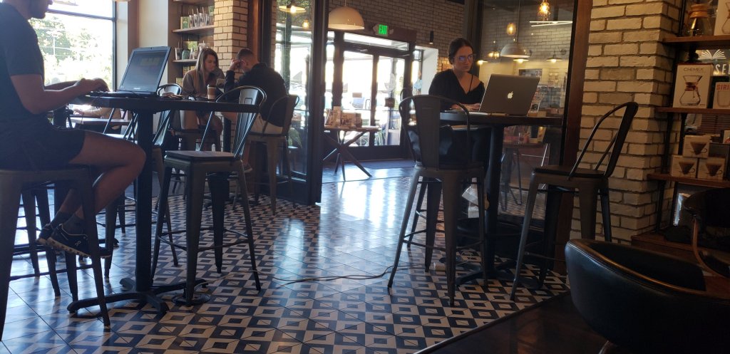 We love the atmosphere inside of this tastefully decorated store. We’ve talked about it several times, and we agree that this is a place that both men and women can feel comfortable in. We love the dark stained wood and how it plays off of the black and white, the patterned floor in the middle of the transition between the coffee shop and the bookstore, the white bricks, and the lighting. Honestly, it’s just a really cool space. It feels “homey.” Is that the right word? We think it is.