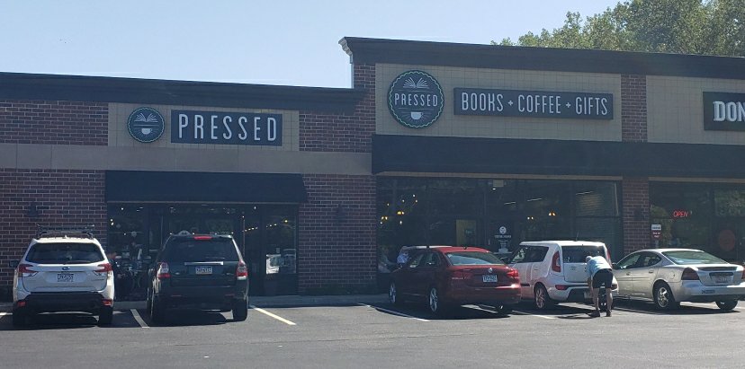 Pressed Books and Coffee is located at 1535 West 8th Street, Erie, PA 16505 in Greengarden Place. It is sandwiched right in between Donatos Pizza and PopLuck. There are two large signs above the two entrances into this book and coffee shop in Erie, PA.