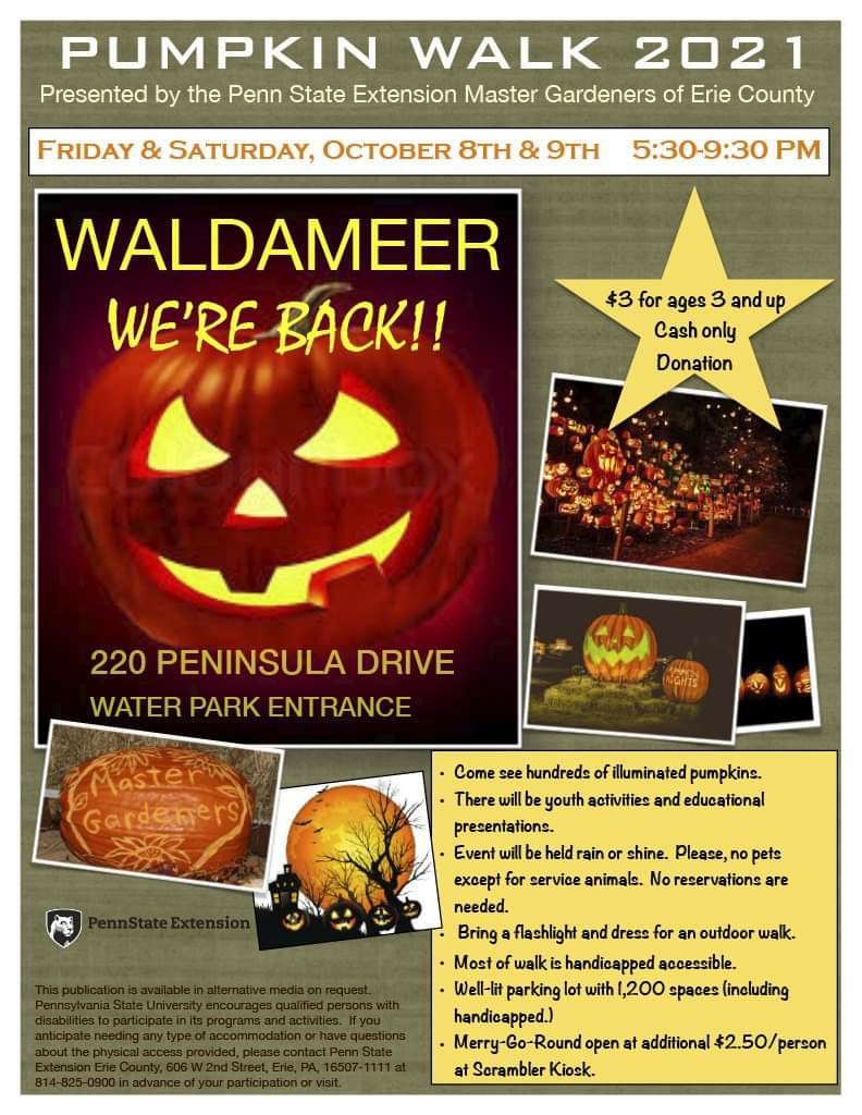 October 15 &16 at St. Nick’s Picnic Grove, 5131 Old French Road, Erie, PA, 16509. A fun and safe drive-thru Halloween experience for children under 10. Dress your kids up in their costumes and drive through the transformed Grove property for a fun evening!