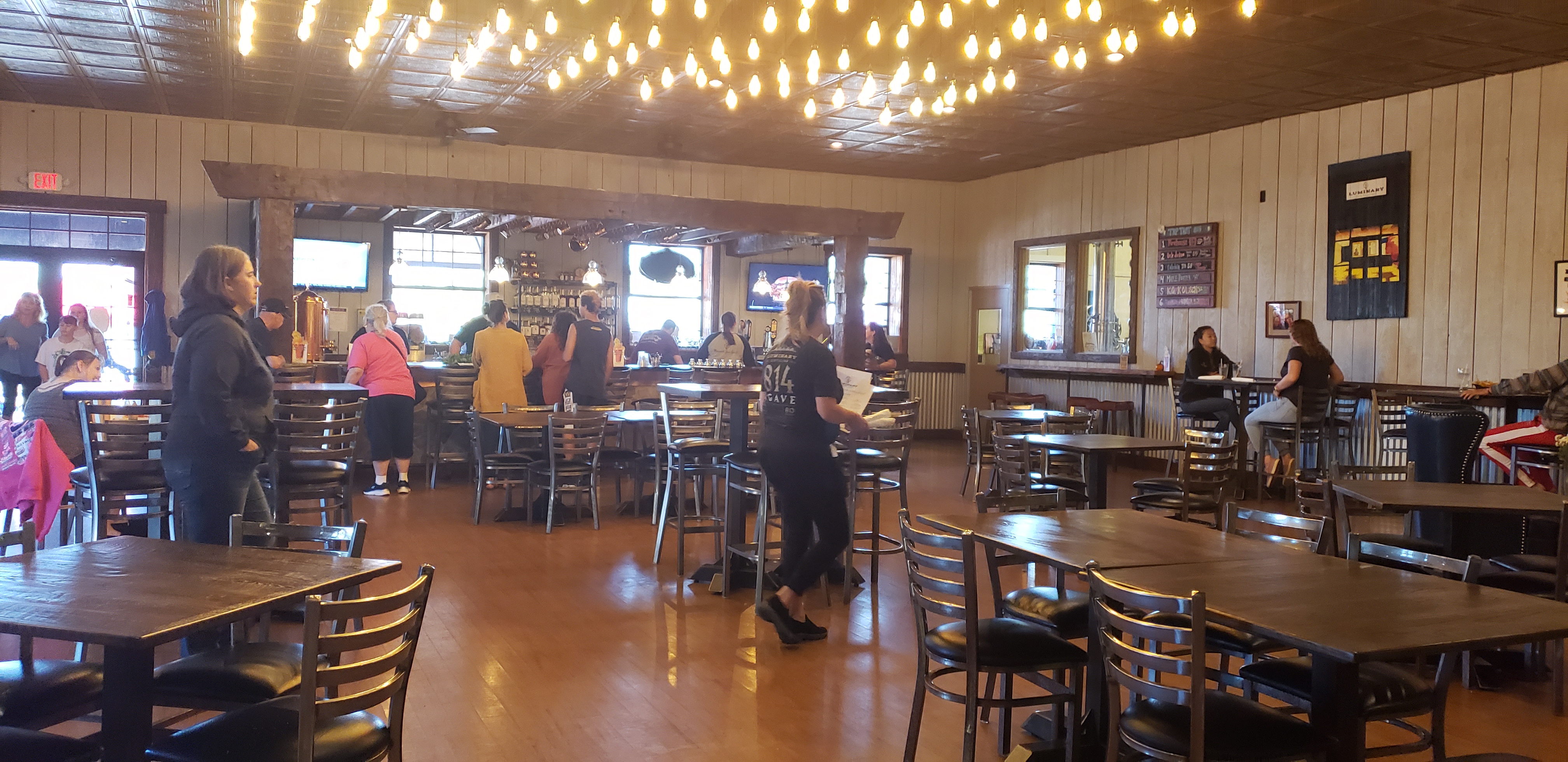 All around Luminary Distilling, you will see small vendor tents set up, tables, and a stage. You’re also welcome to go into the restaurant and grab a bite to eat off of their menu. The inside of this building gives off a modern country vibe.