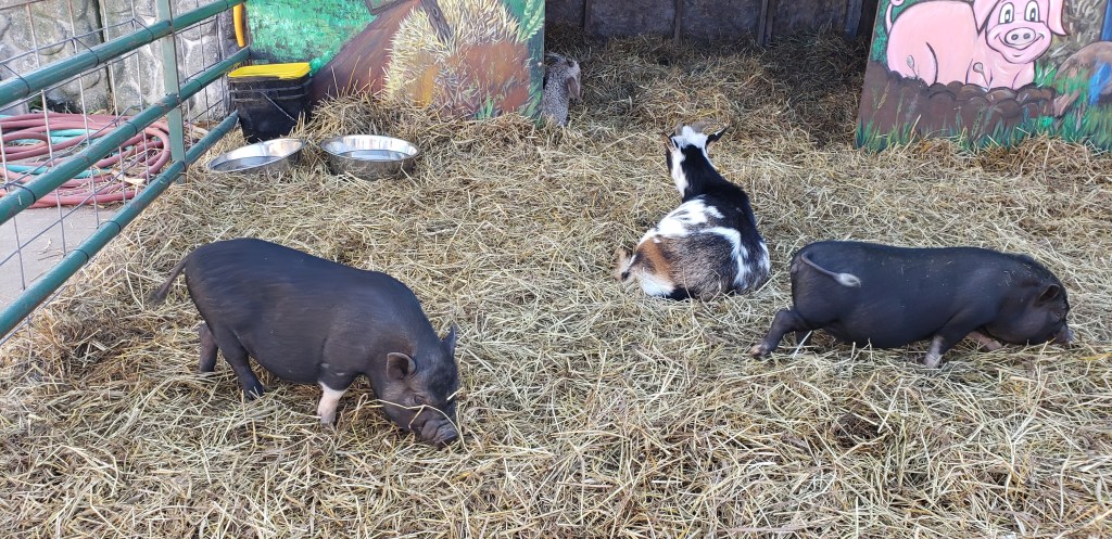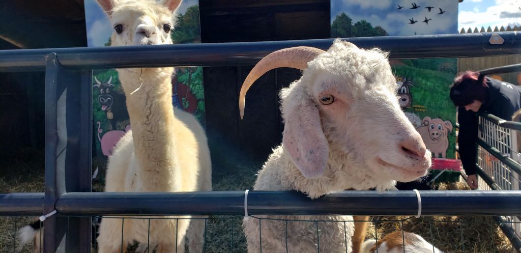 Another fun thing that the littles love about Pumpkintown at Mason Farms is the petting zoo! We love the animals that are there this year, each one was super sweet and good with the kids! We saw llamas, goats, sheep, and even two little black pigs! You can feel free to pet them and to feed them. There are feed machines near the pen and it will cost you a quarter to give them a pretty decent amount of food. With one quarter, our littles got about 7 turns to feed the animals. We put the food in their hands from the big pile we got from the machine, and gave them a smaller amount than what would be a handful for them.