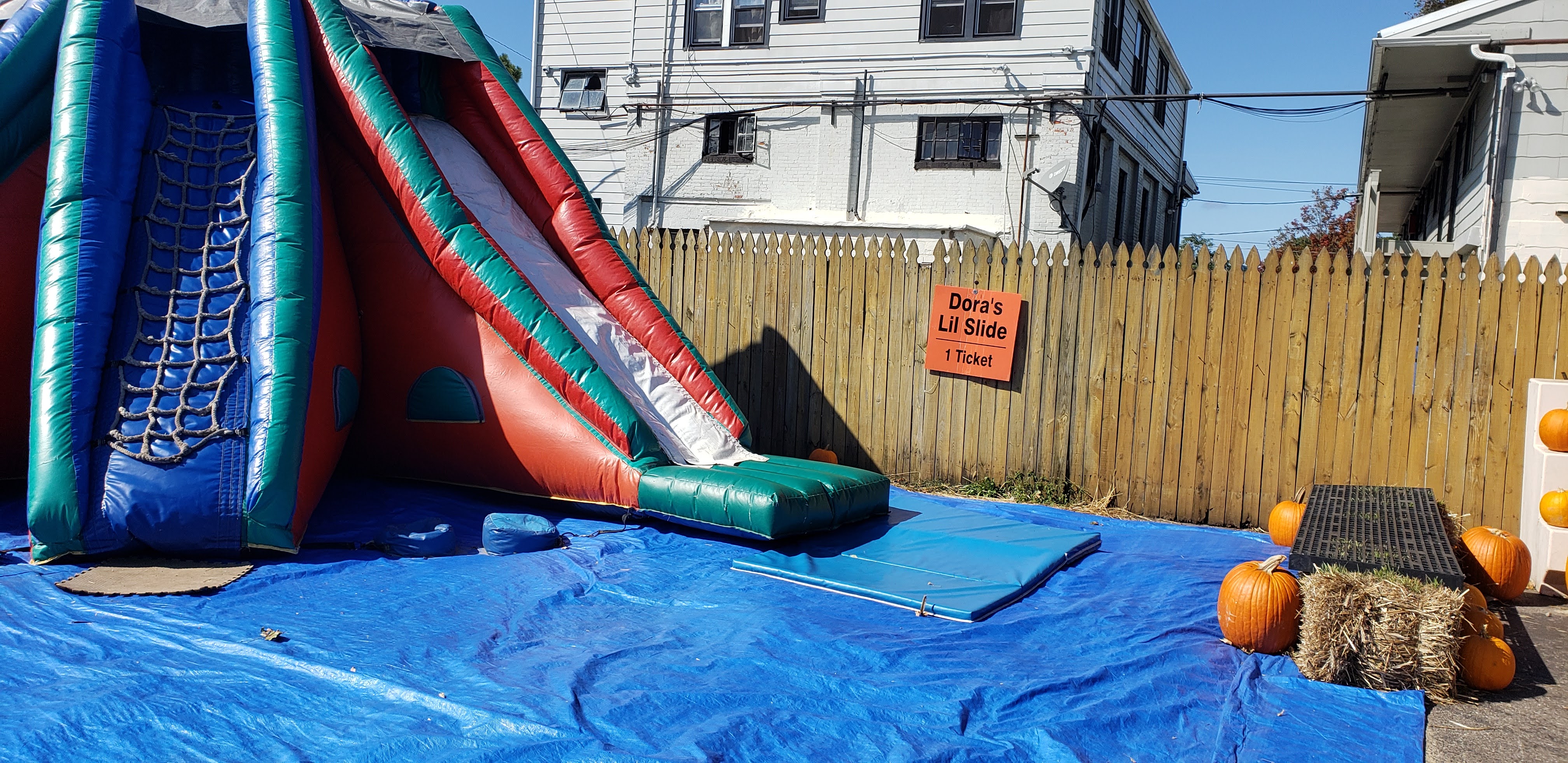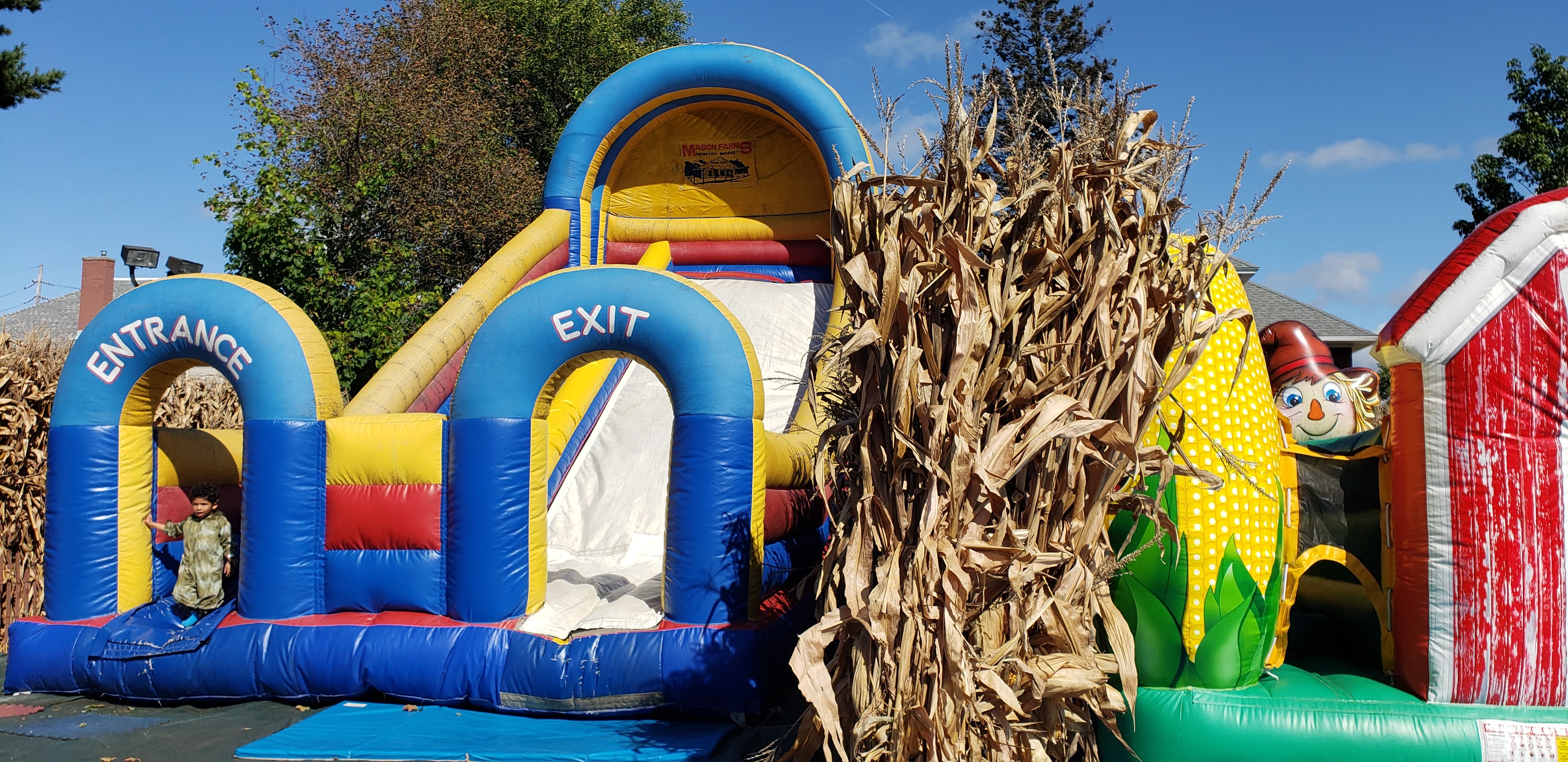 The outdoors of Mason Farms Country Market is transformed into a giant Fall Fest for Pumpkintown! If you go into the entrance of the large store as normal, you can continue your way through the store and into the greenhouse. Once you get inside the greenhouse, go into the center aisle and turn left. Continue until you have exited the back door. There you will see a farm themed petting zoo straight ahead, and if you turn to your left again you will head towards the snack and ticket stand, which is right after a Paw Patrol pumpkin display. Once you pass the stand, you will see a photo opp set up, and beyond the photo opp, you’ll see several inflatables set up, as well as a corn maze and picnic table eating area.