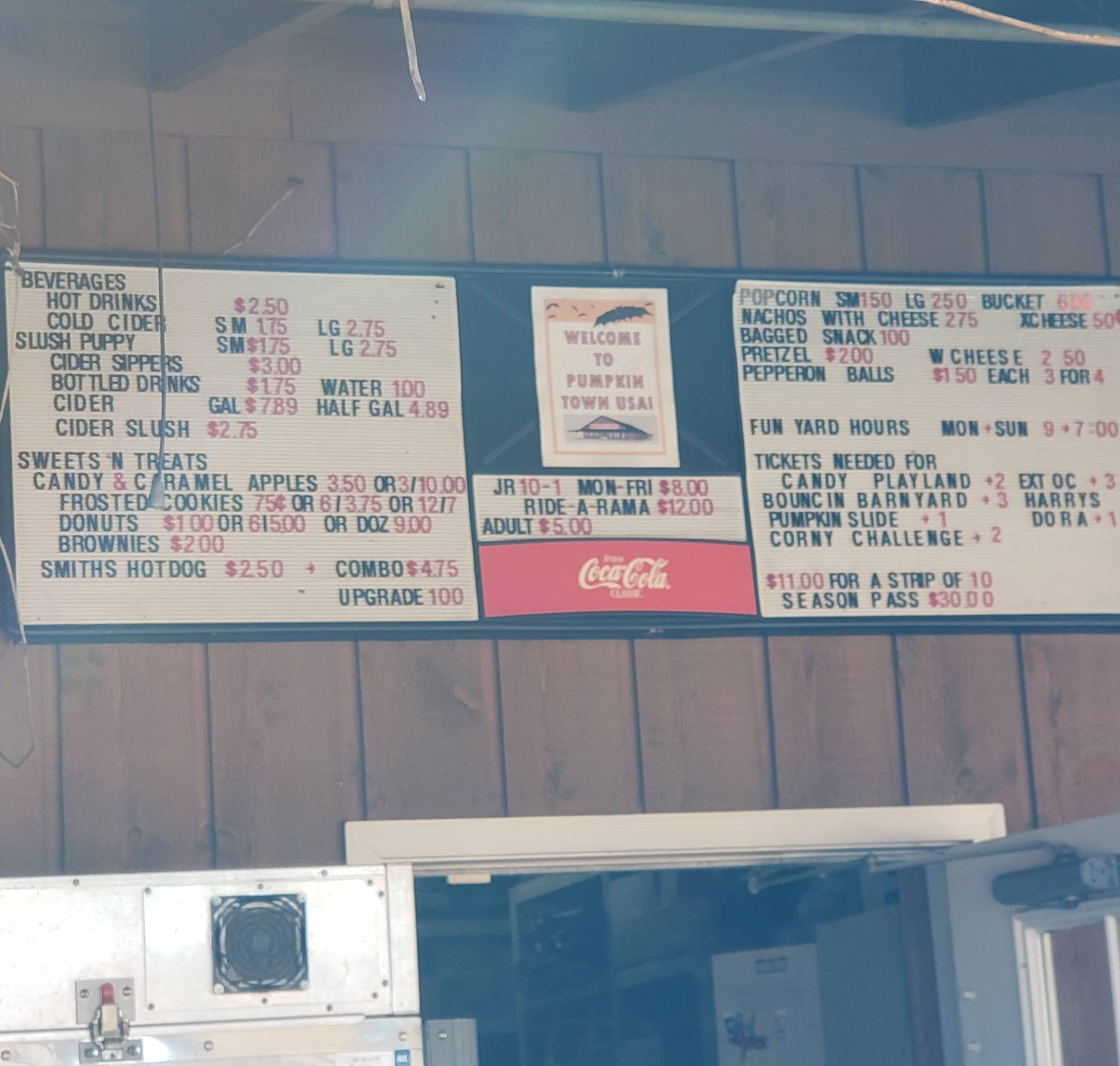 You can purchase a variety of refreshments at the concession stand, including little souvenir bottles of apple cider. This was a hit with out littles, as one of them would not let go of the bottle the entire time we were there. They also have slush puppies, water, popcorn, pepperoni balls, candy apples, hot dogs, brownies, pretzels, and much more!