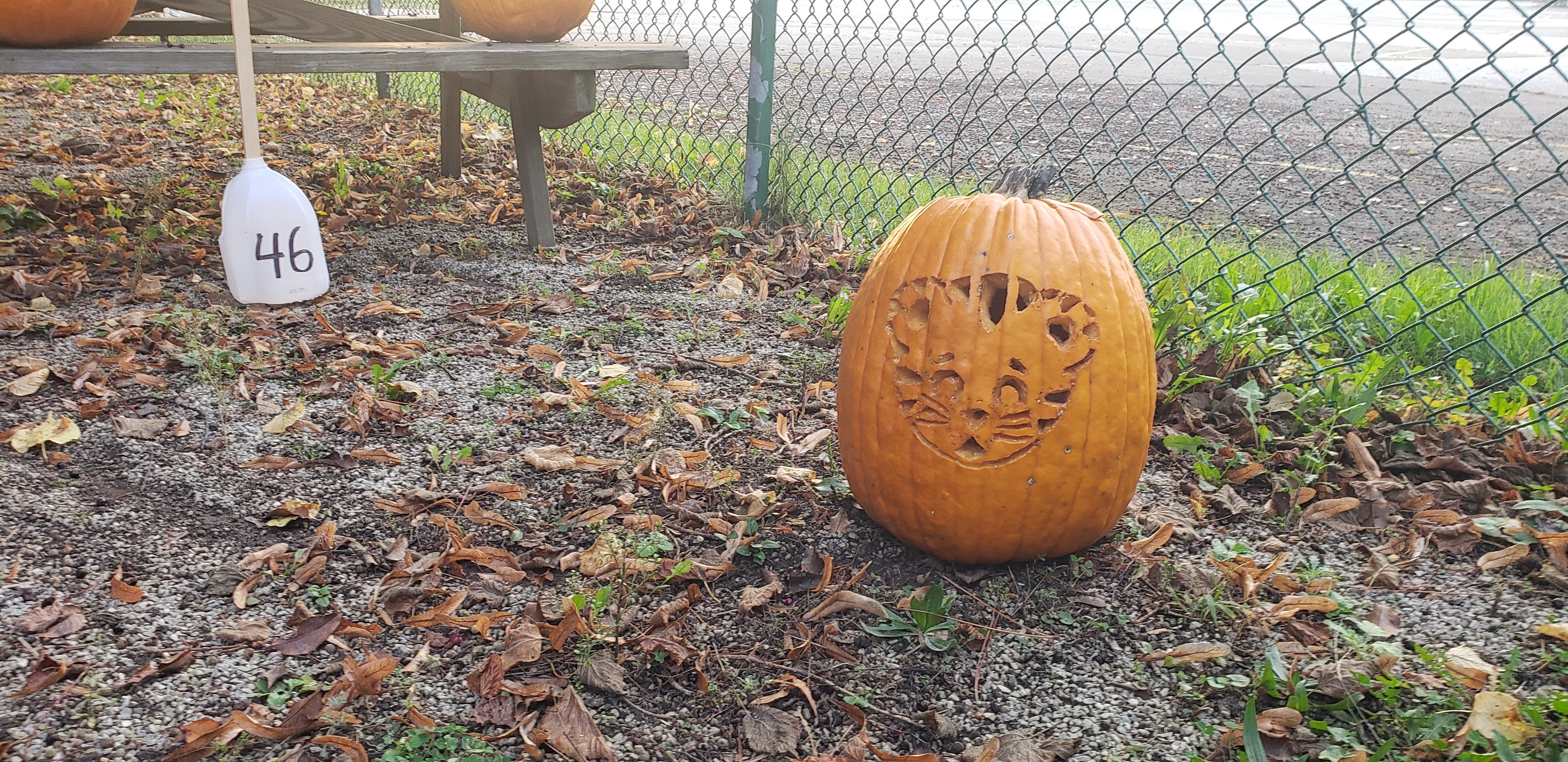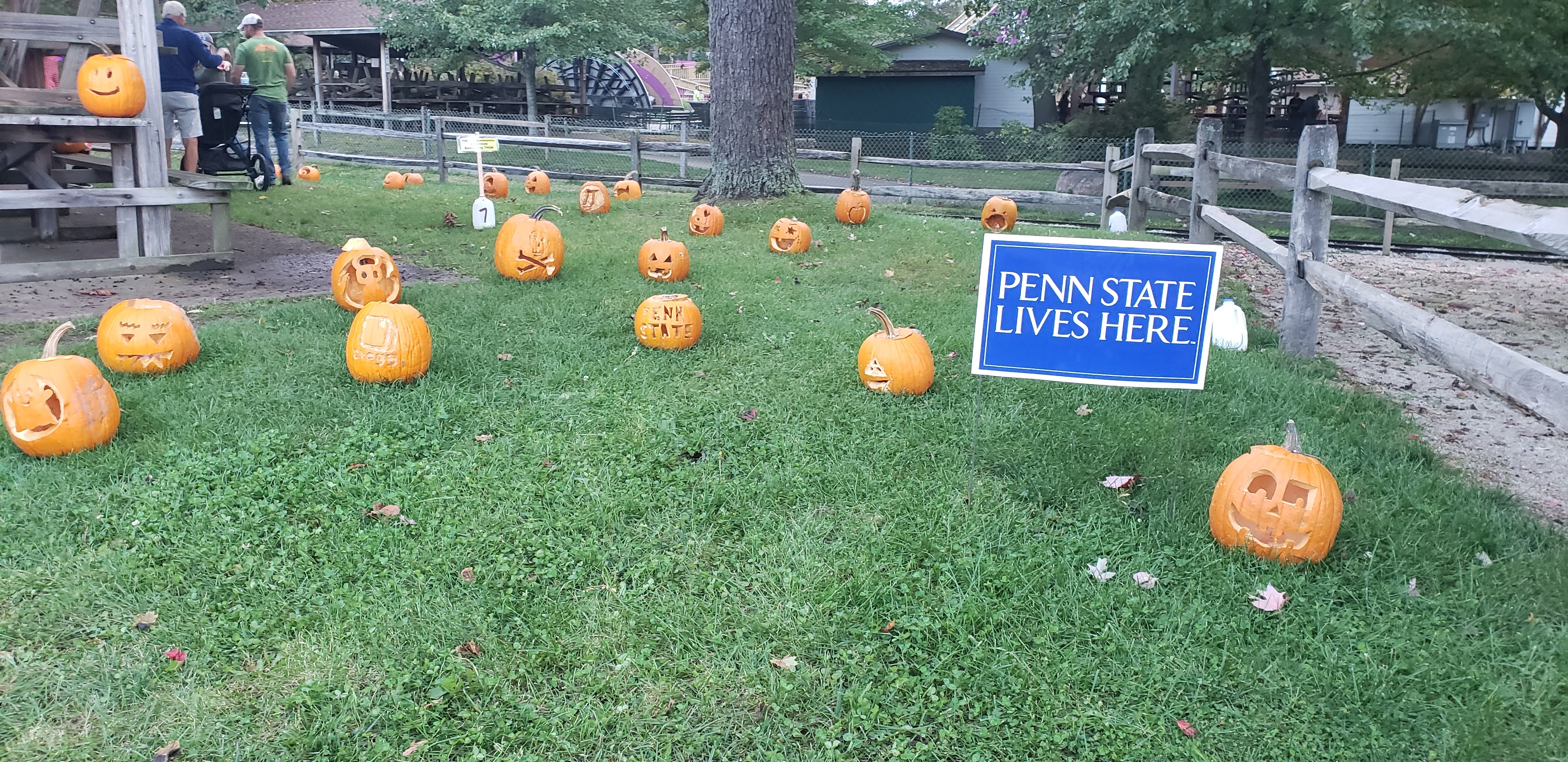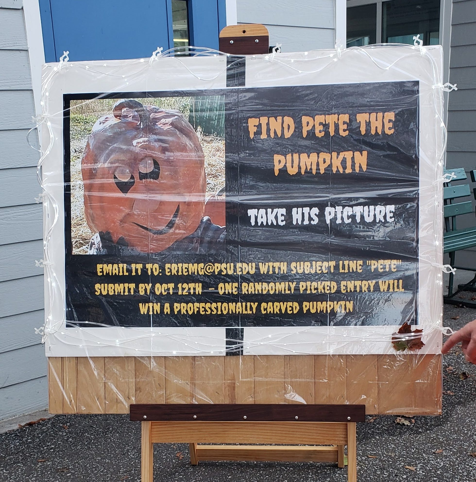 We were told to look for a pumpkin on our walk; his name is Pete the Pumpkin. Once you find him, take his picture and email it to eriemg@psu.edu by October 12, 2021. One randomly selected winner will win a professionally carved pumpkin! We found him, will you?