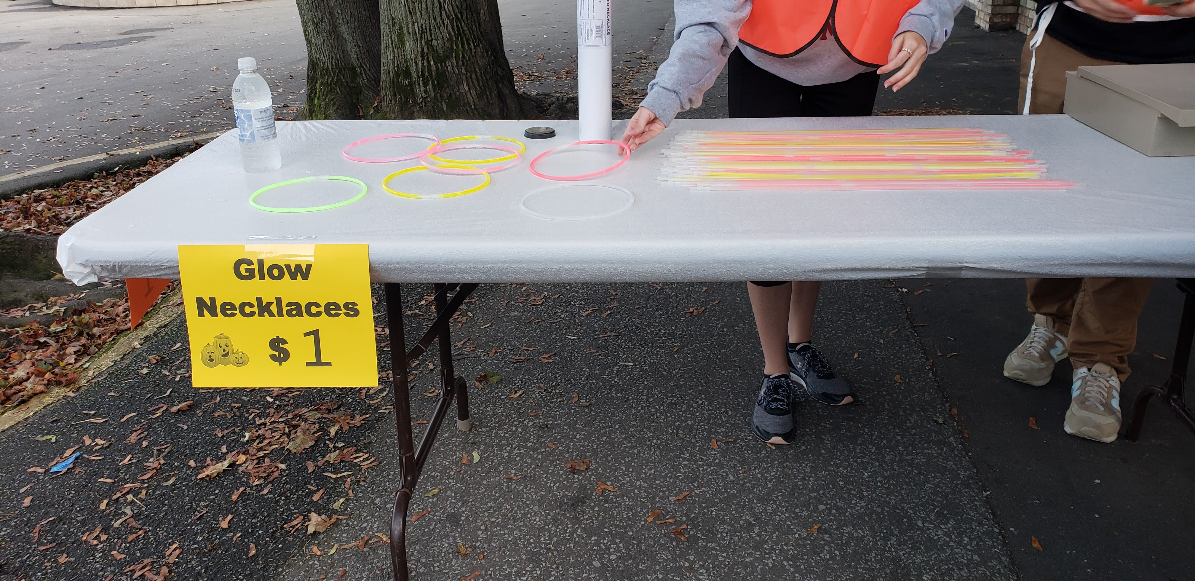 After you pass the Pete the Pumpkin information, you’ll see a table selling glow necklaces for $1 per necklace to your left.