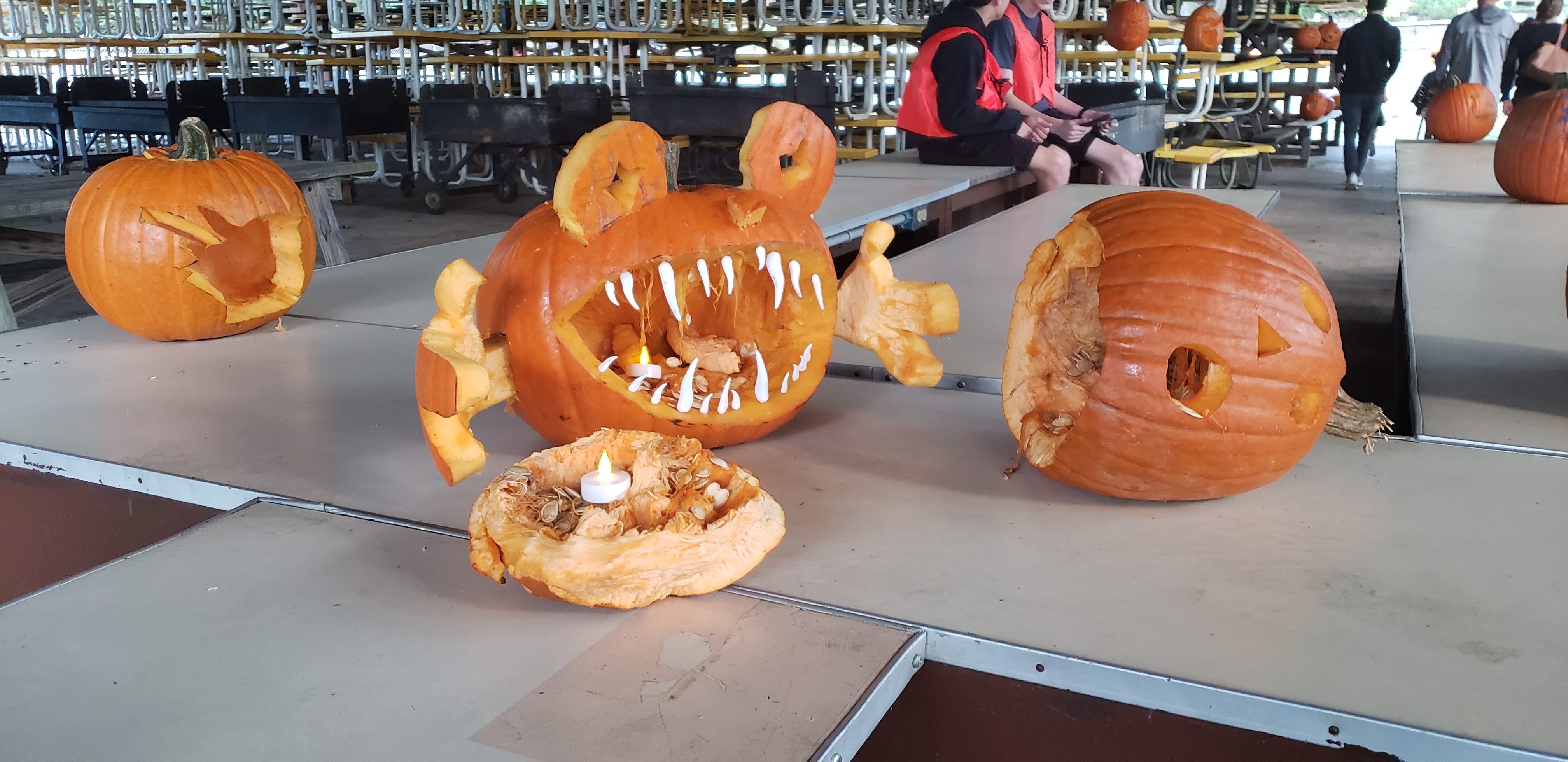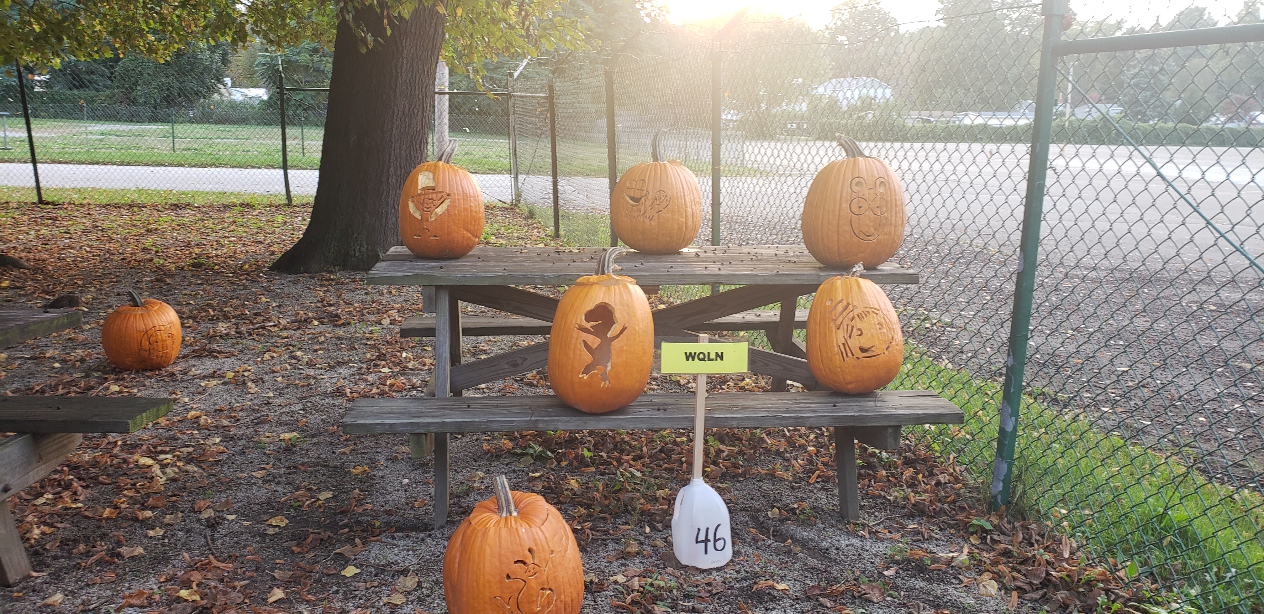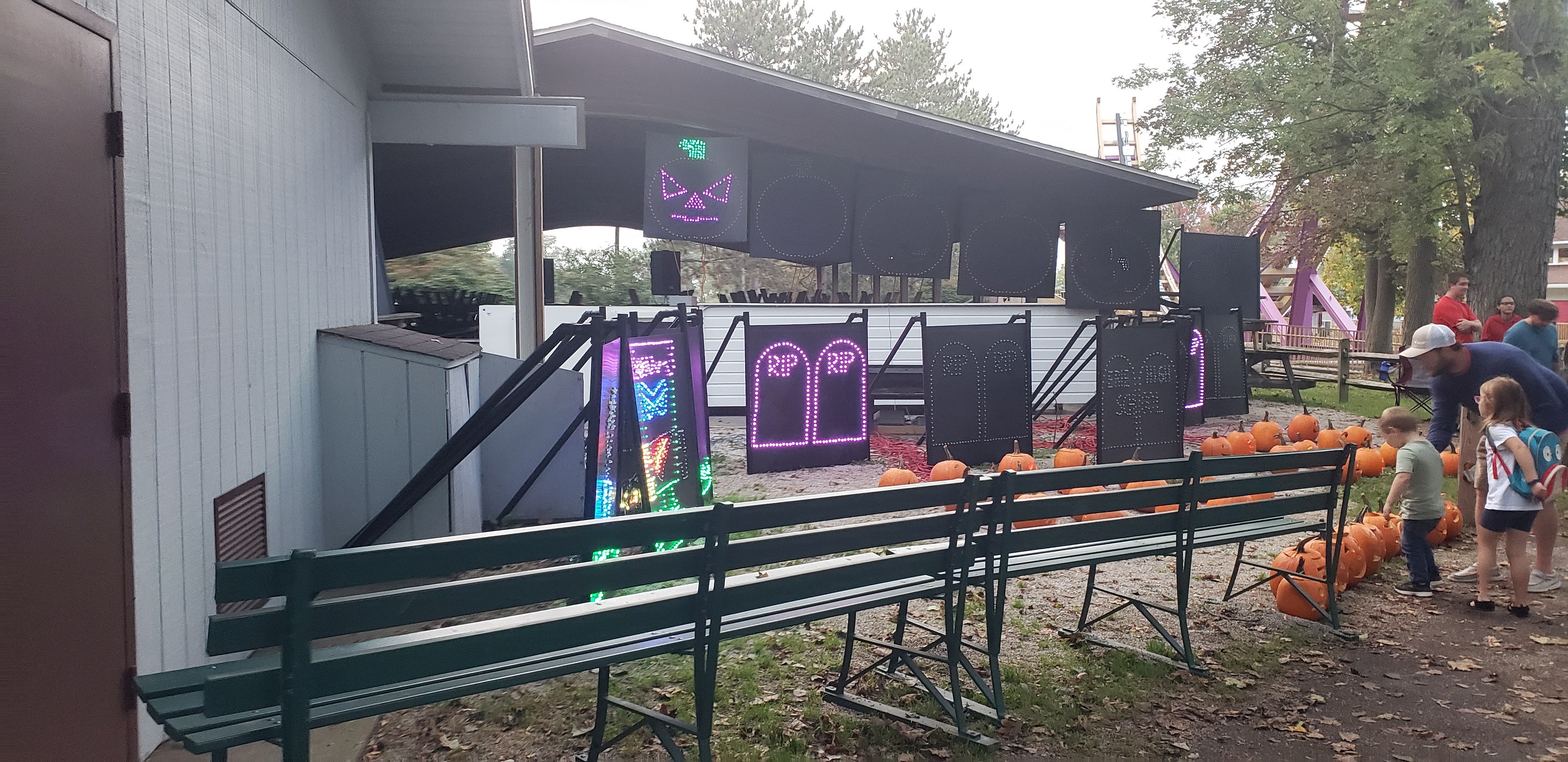 After the concession area, you’ll see pumpkins carved for the sponsors of the event. These pumpkins were beautifully carved, with business logos and Halloween flair.
