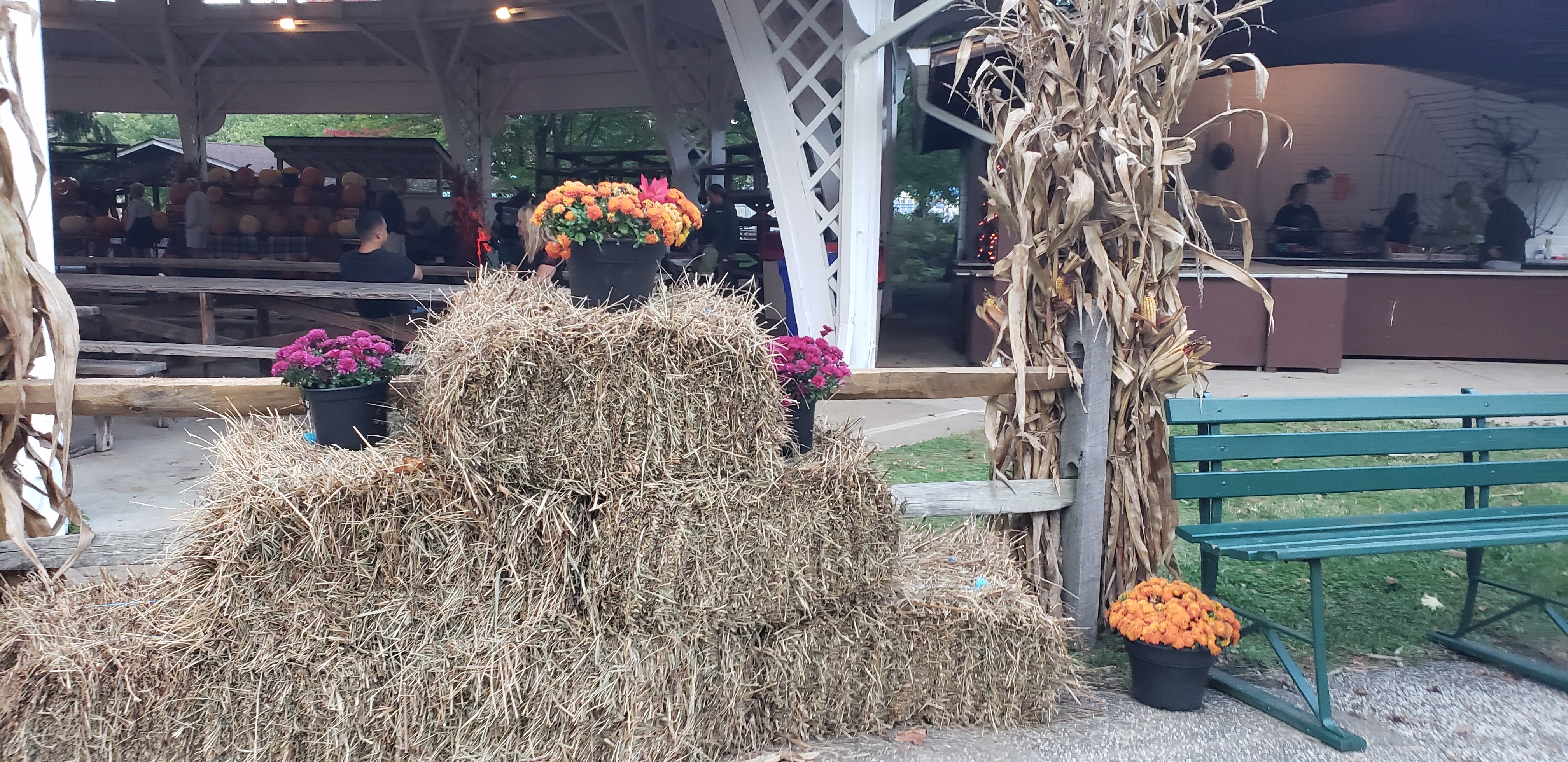 Around the outskirts of the concession pavilion, there are a few photo opp displays set up. One with pumpkins and holes in them, another with hay, mums, pumpkins, and tinsel cats, and a couple more with hay and mums. This presents a great opportunity to grab a photo or two to capture some memories of your pumpkin walk.