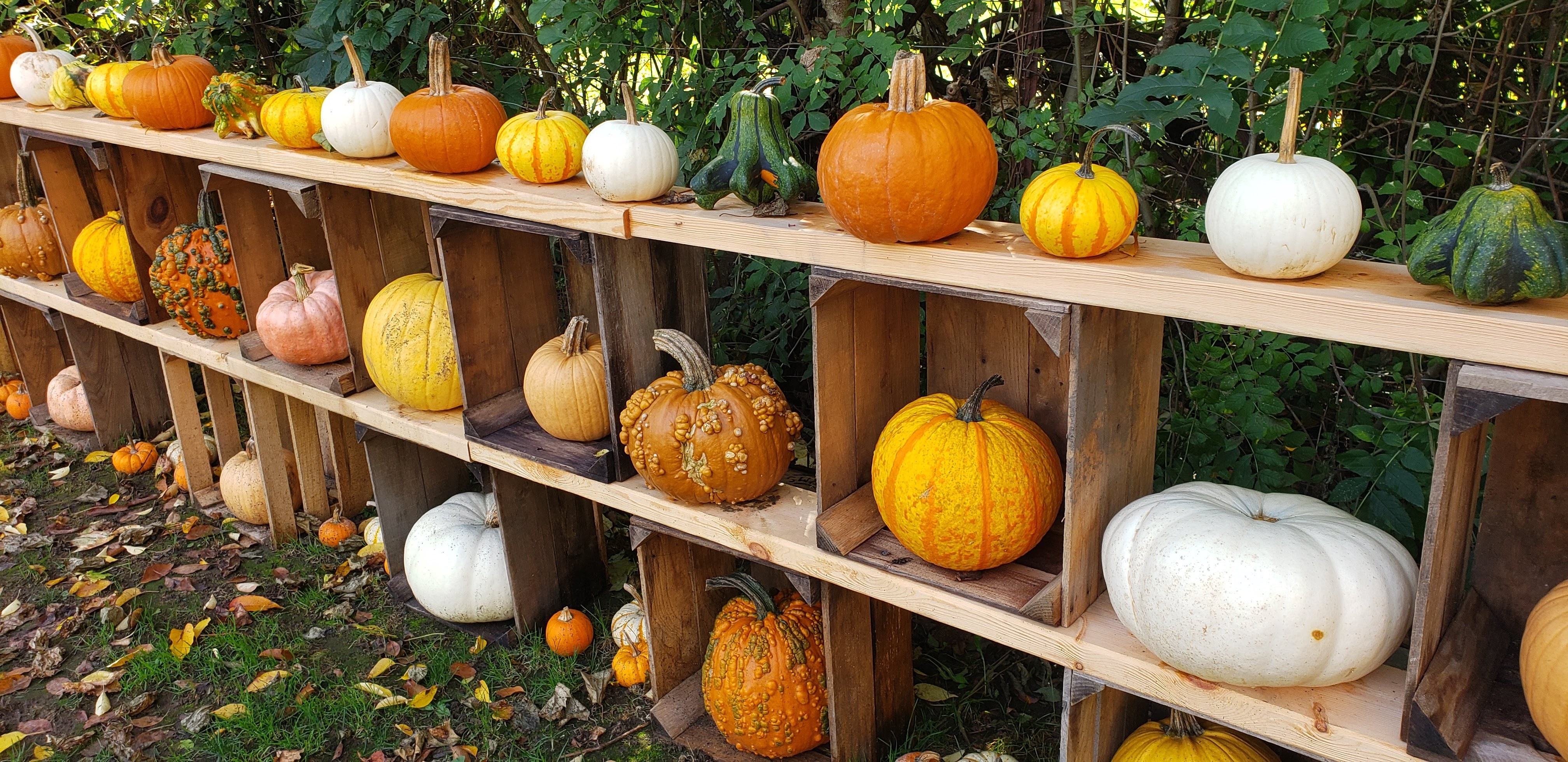 Continue forward and you’ll see pumpkins of all kinds! Set up in rows, these pumpkins mostly differ from each other. Several other Fall gourds are set up around as well.