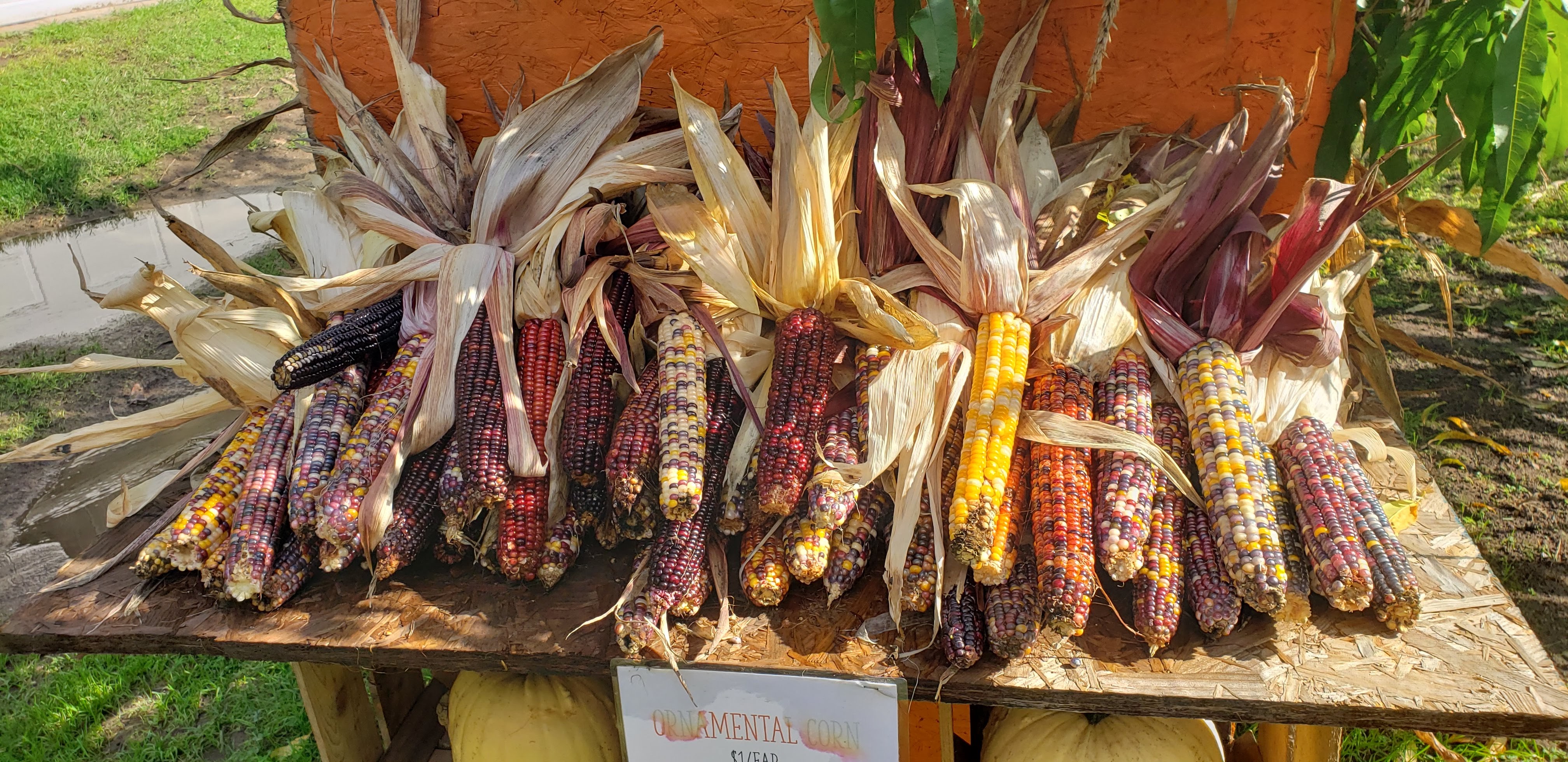 They also carry a variety of small gourds, such as tiny pumpkins and squash, octopus squash, and little white pumpkins. You’ll also find Indian corn and mums in several colors and even hay.