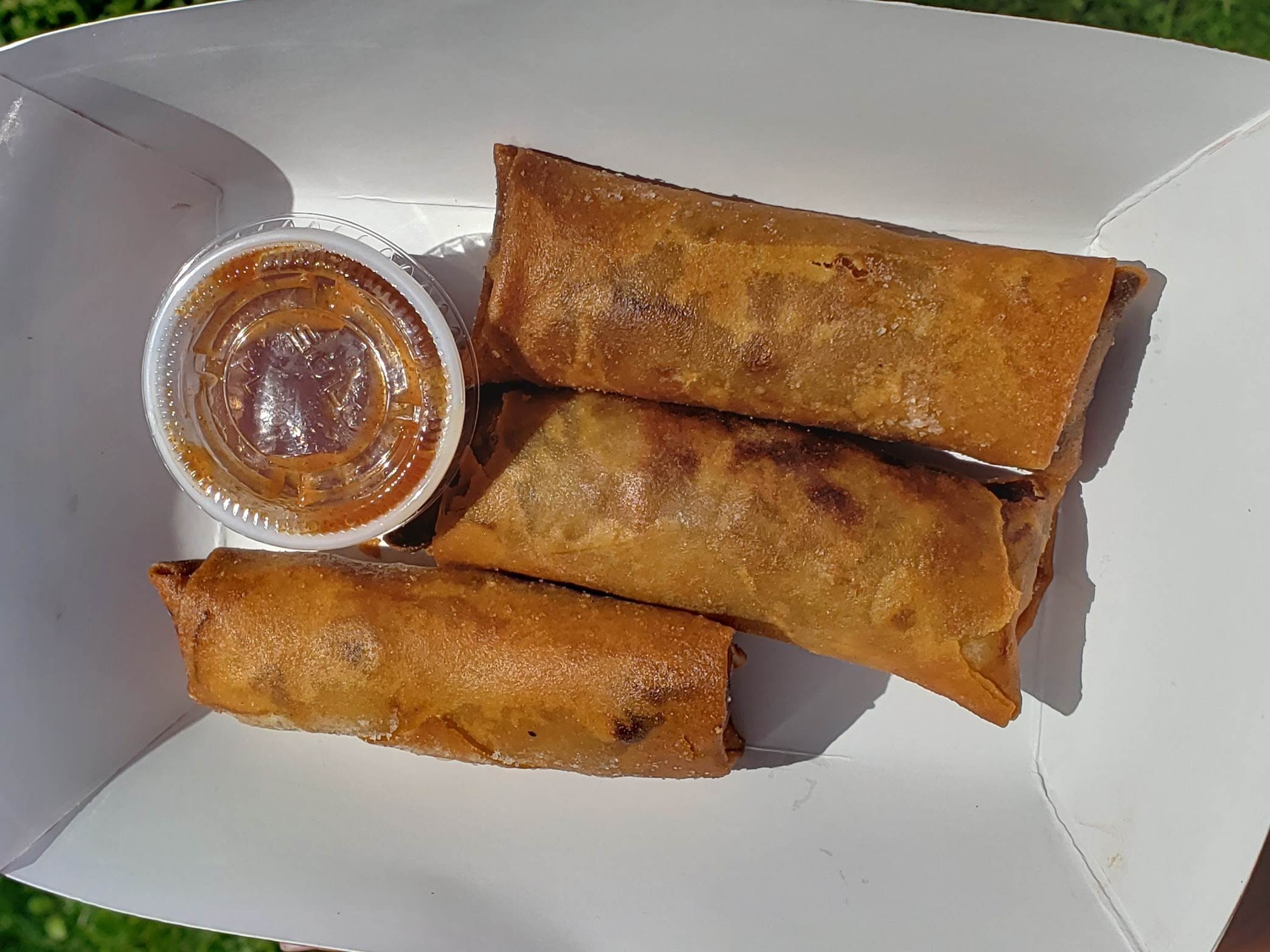 Sun Roll serves sushi, spring rolls, and other Asian favorites. This truck was pretty packed, but we really wanted to try it. After a decent wait (only because of the long line), we received our food. The food was so worth the wait. Everything was delicious. We got a sushi burrito, mango roll, fried vegetable spring rolls, and Thai ice tea. It was our first time trying Thai iced tea; it’s a cold tea served with milk and spices. It presents as a “creamsicle” color that melts down into typical iced tea color (photo above), but don’t let that fool you as it does have a kick of spice in it. While the adults enjoyed the flavor, only one little liked it. And by liked, we mean really liked; might be a new favorite drink!