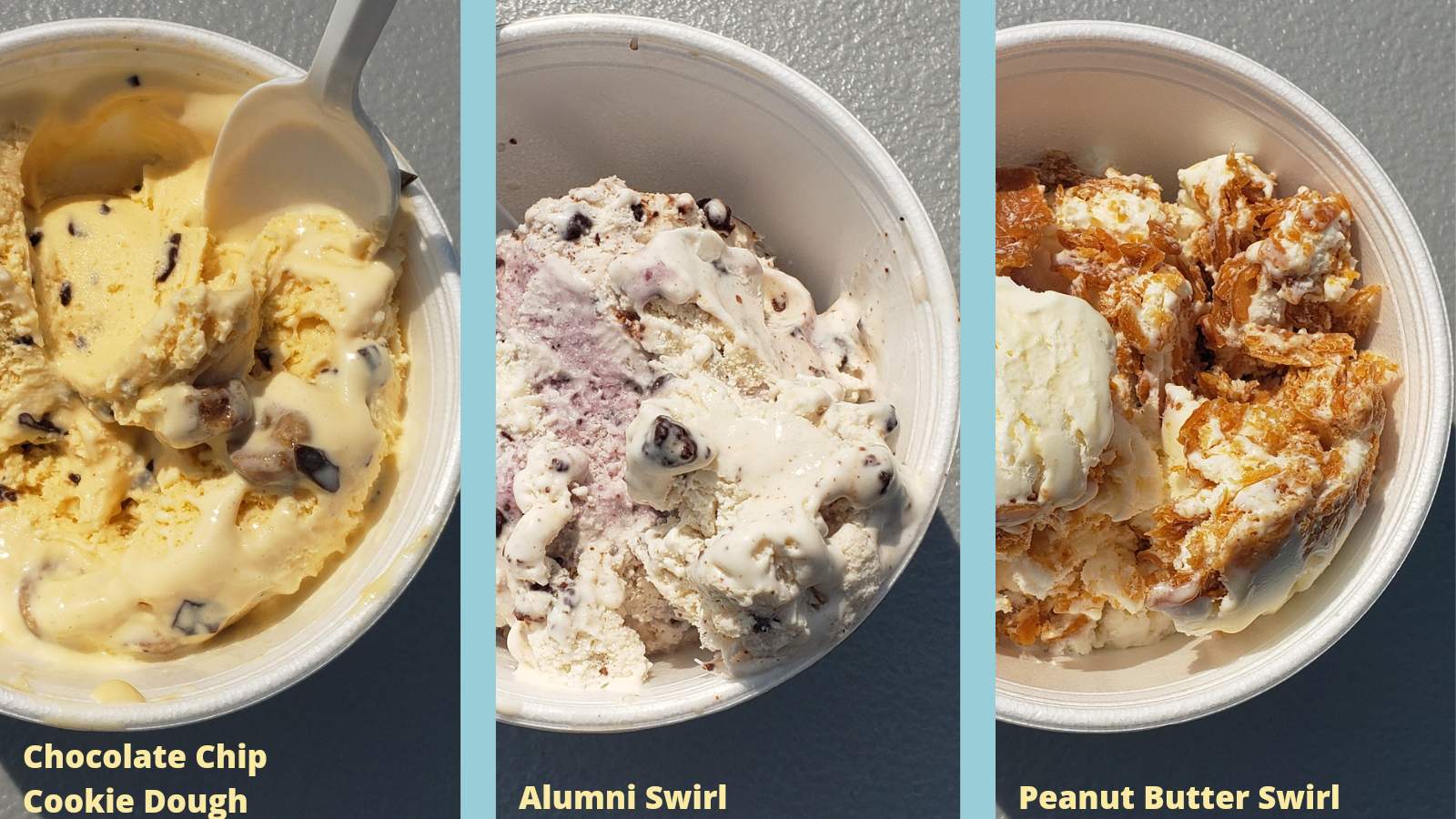 One flavor we decided to try is the classic Chocolate Chip Cookie Dough. It has large chunks of cookie dough and chunks of chocolate swirled throughout. The second flavor we tried was Alumni Swirl. This was quite the combination of yummy. It consists of vanilla ice cream with swiss mocha chips and blueberry swirl. The perfect combination of chocolate goodness paired with fruit. The last flavor we tried on this trip was Peanut Butter Swirl, which is made up of vanilla ice cream with peanut butter swirl. This flavor is definitely for peanut butter lovers, as it had the most amount of peanut butter we have ever experienced in an ice cream such as this! And believe us, that’s a good thing! If you appreciate peanut butter, this is the ice cream for you.
