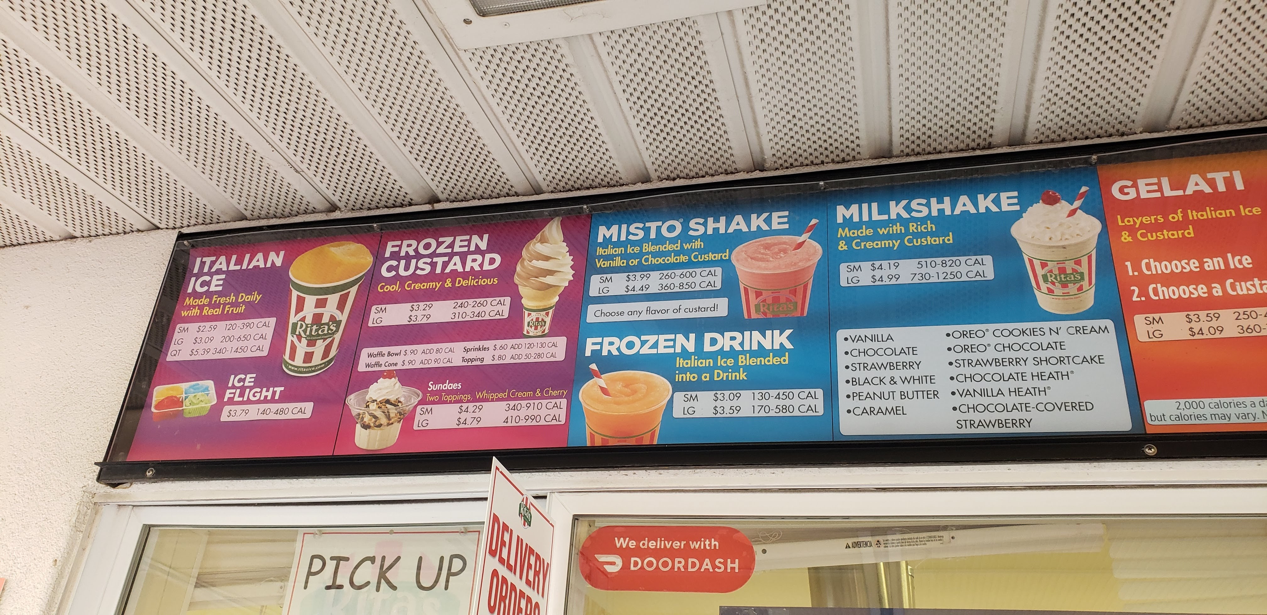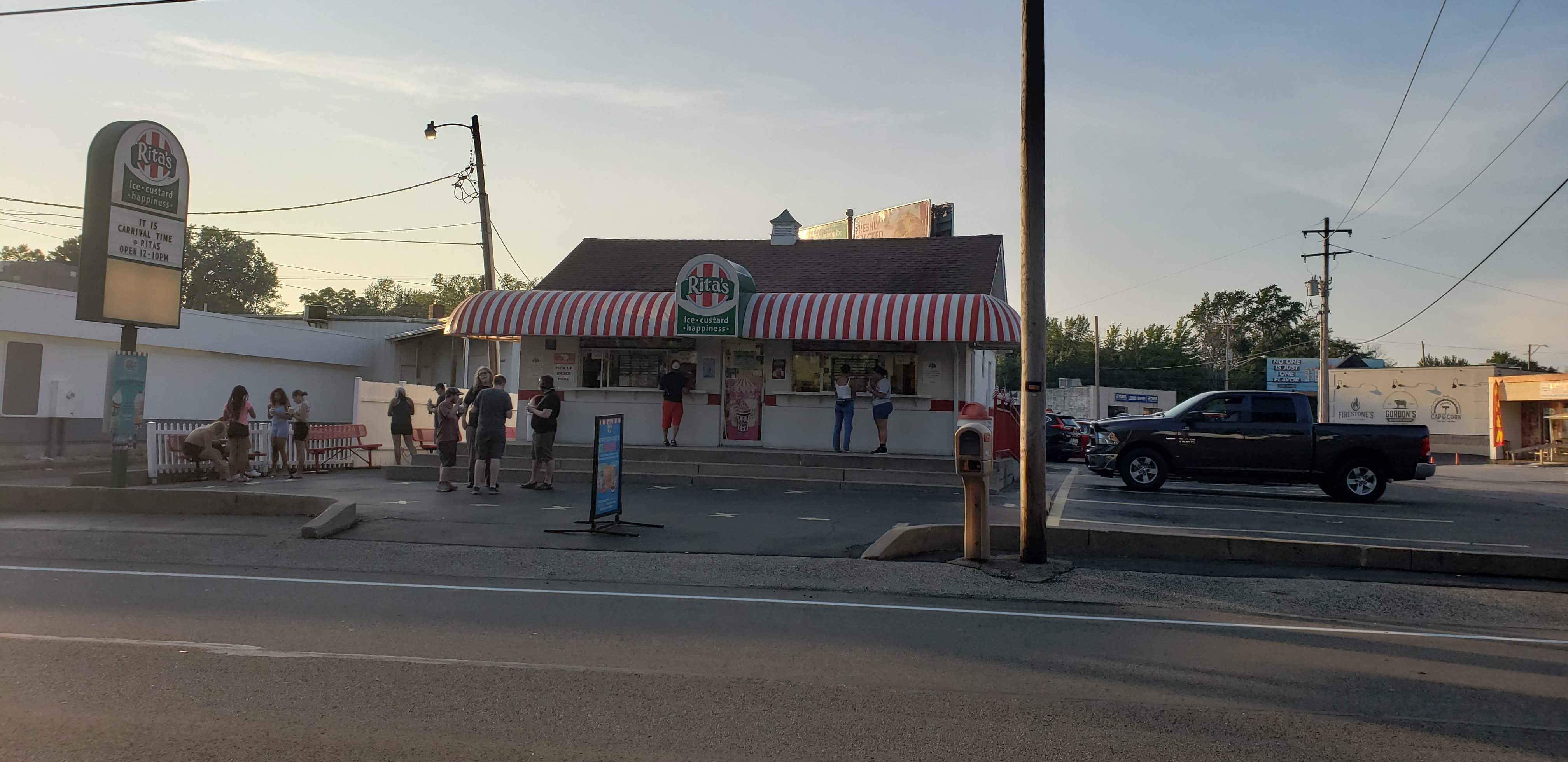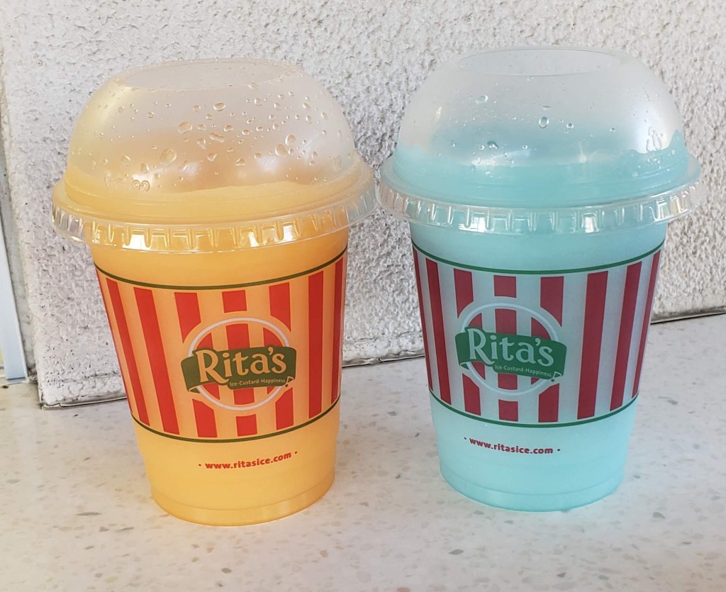 Rita’s is an outside only Italian Ice and Frozen Custard stand for patrons. You will stand in line and order through a window. Once you get your treats, you can hang out on the benches to the left of the building or eat in your car.